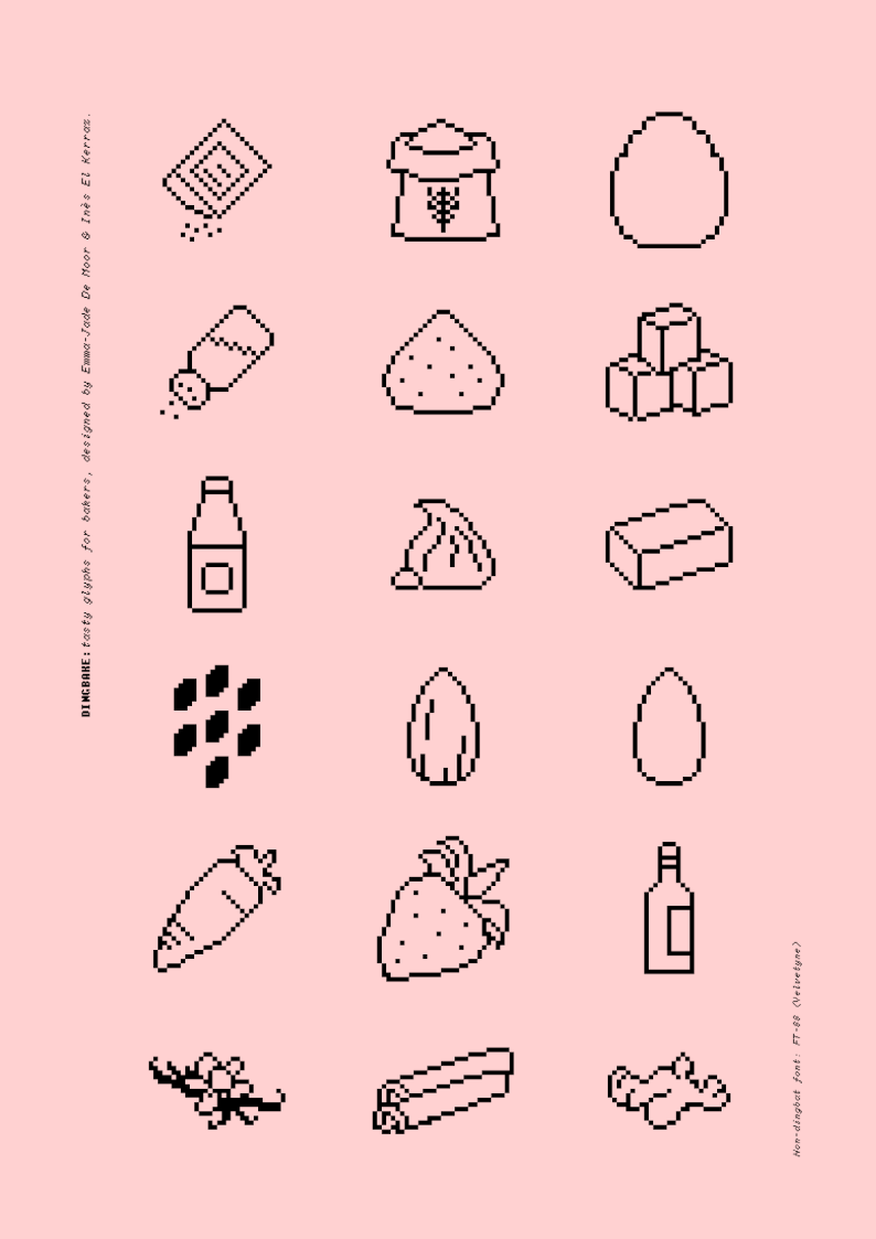 Dingbake est une police de dingbats représentant les ingrédients nécessaires à la pâtisserie. Dessinés avec l’outil glyphdrawingclub, les glyphes proposent une alternative typographique à l’image matricielle.