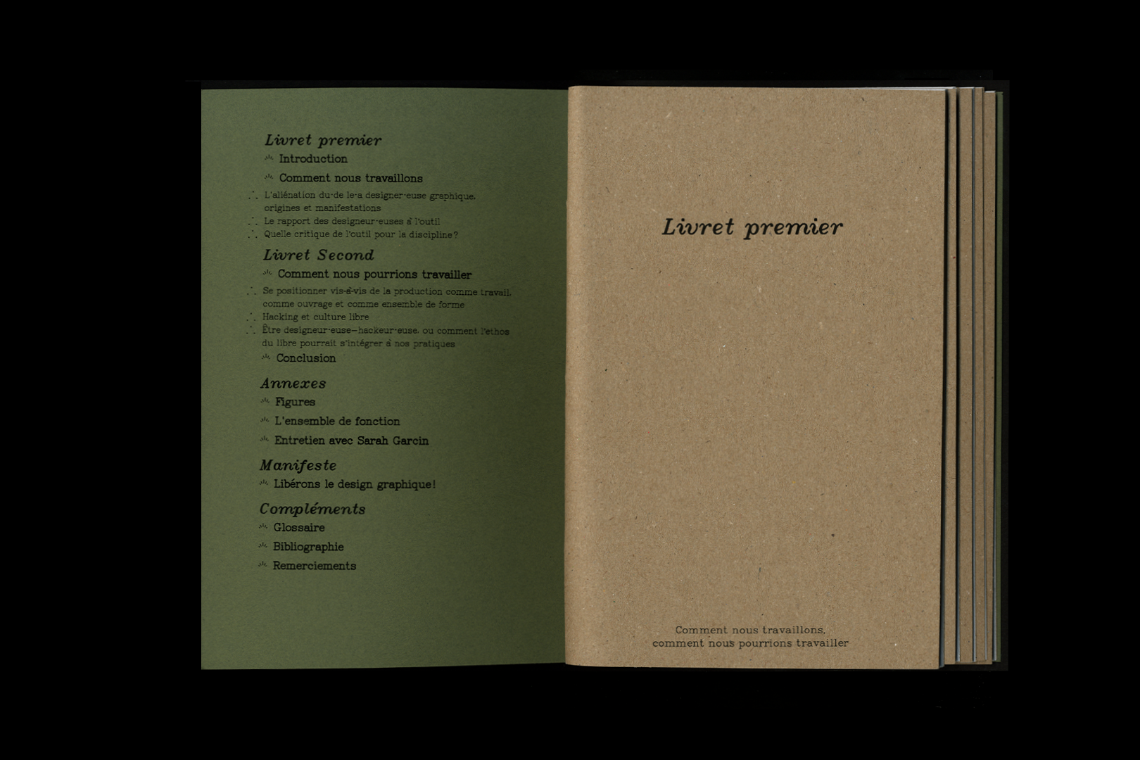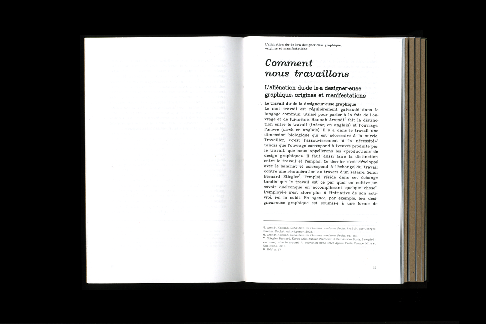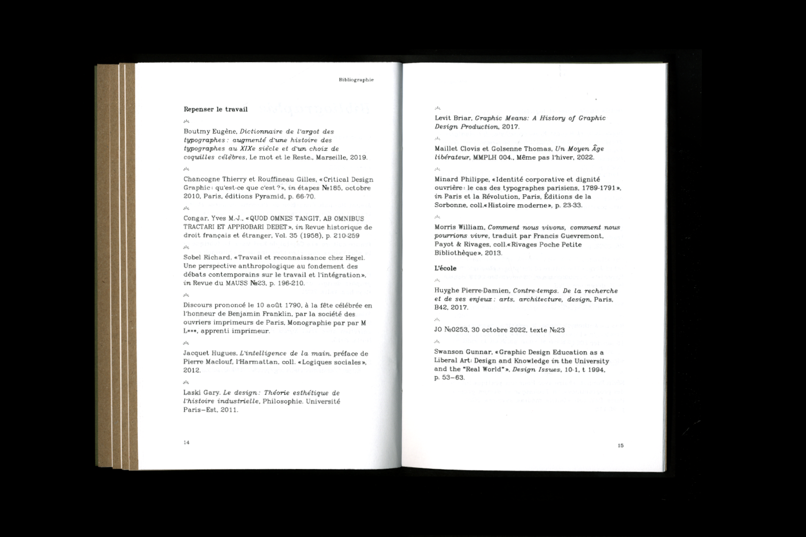 Mémoire de recherche professionnelle sur les rapports des designeur·euses graphiques à leurs outils numériques, composé en web-to-print à l’aide de de MkDocs et de la librairie Paged.Js. L’édition est constituée de cinq cahiers, dont les contenus ont été réorganisés pour le web. Plusieurs scripts Javascript permettent la gestion des notes et des légendes, la génération du sommaire, l’indication en gras des mots définis par le glossaire et - pour la version web - l’ouverture des images dans un nouvel onglet lors du clic.