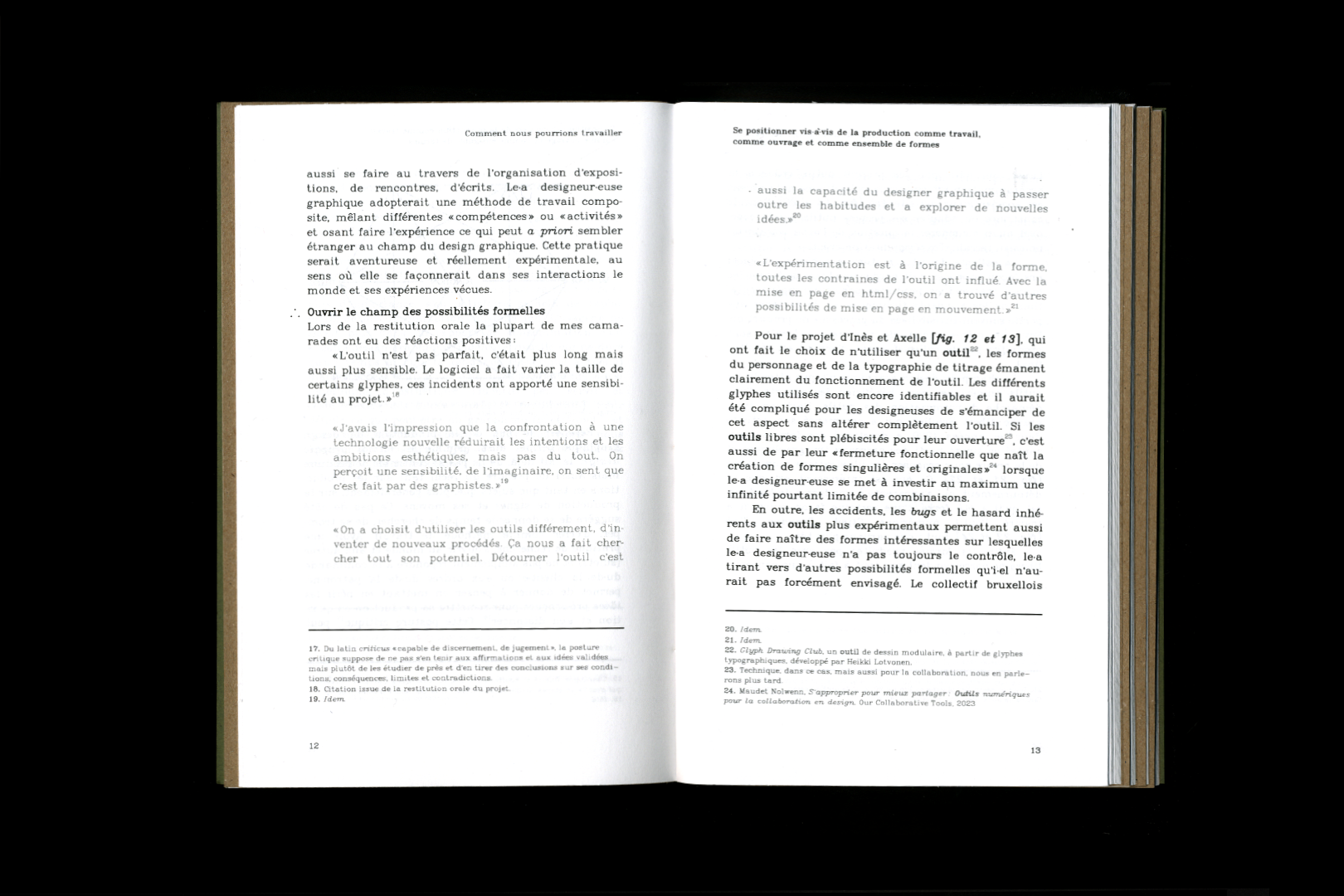 J’y explore les notions d’outil, de machine et de travail en étudiant les enjeux éthiques, sociaux et politique des outils propriétaires et des outils libres. L’écrit s’appuie sur des lectures théoriques et des enquêtes dans la praxis au travers d’entretiens, d’un corpus et d’échanges informels qui ont ponctué mes rencontres avec la communauté des designeur·euses graphiques intéressé·es par ces problématiques.