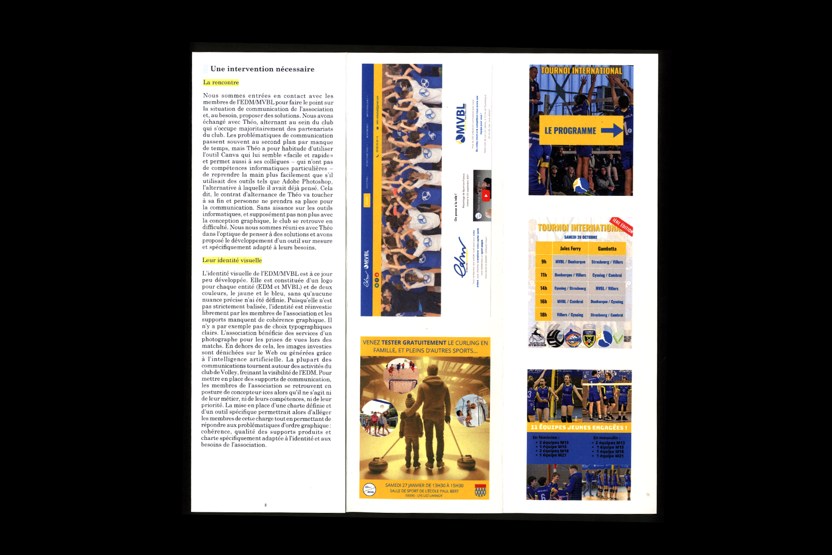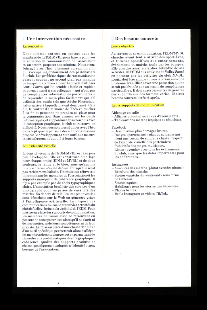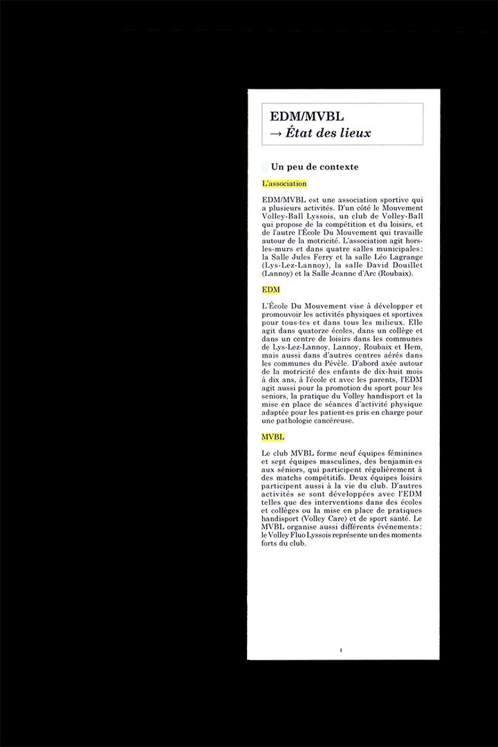 Le texte fait état de la situation de communication de l’association sportive EDM/MVBL de sa charte graphique à sa réappropriation par les bénévoles et salarié·es. Pour mettre en place des supports de communication, les membres de l’association se retrouvent en posture de concepteur·ices alors qu’il ne s’agit ni de leur métier, ni de leur compétences, ni de leur priorité.