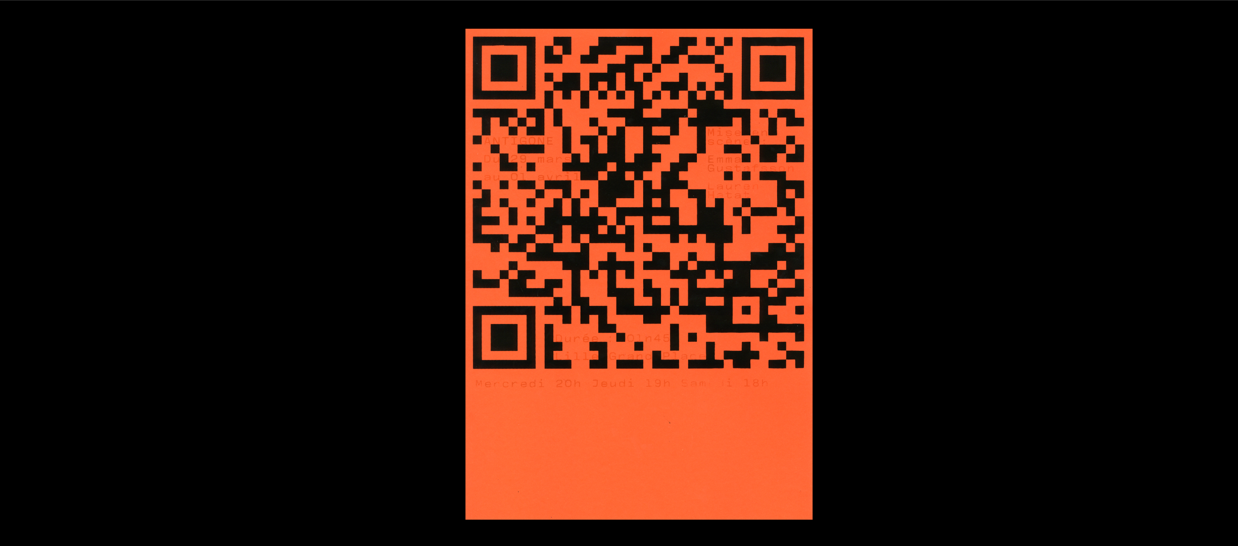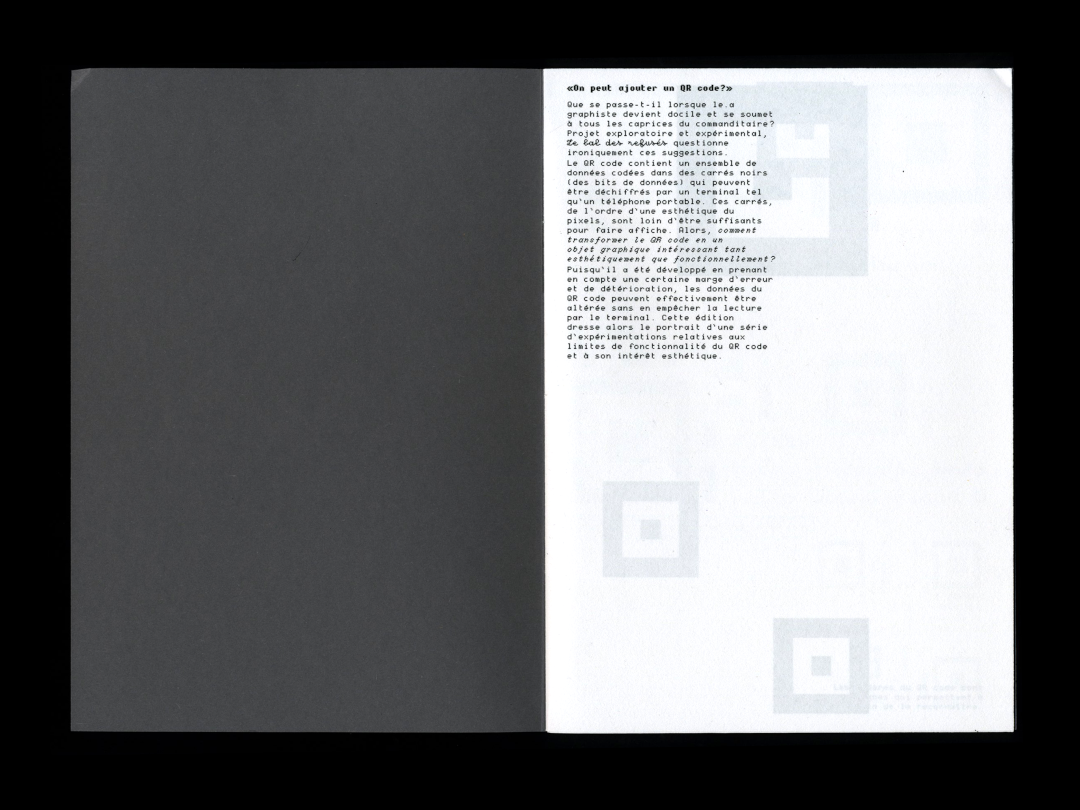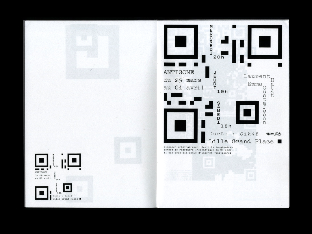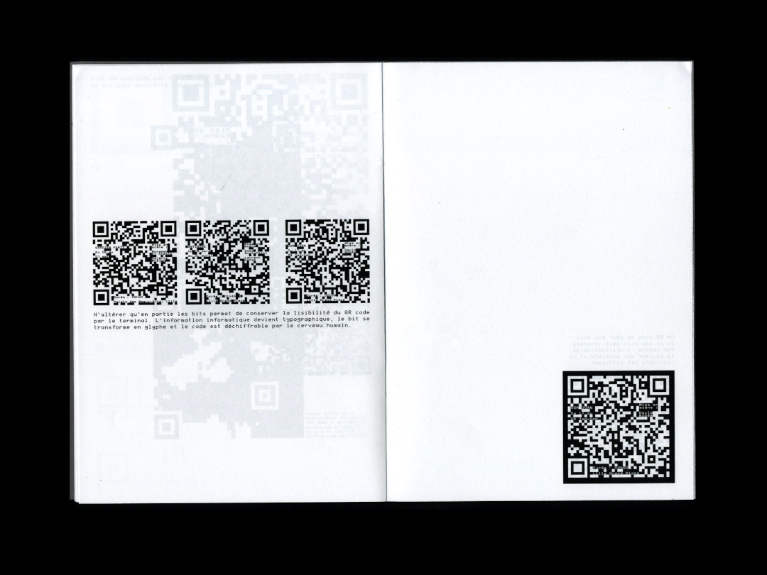 Le QR code contient un ensemble de données codées grâce à des carrés noirs (des bits de données) qui peuvent être déchiffrés par un terminal tel qu’un téléphone. Ces carrés noirs, bien qu’intéressant en terme d’esthétique, sont loin d’être suffisants pour faire affiche. Certains bits de data ont alors été remplacés par des glyphes : cette fois, les données sont directement déchiffrables par le cerveau humain.