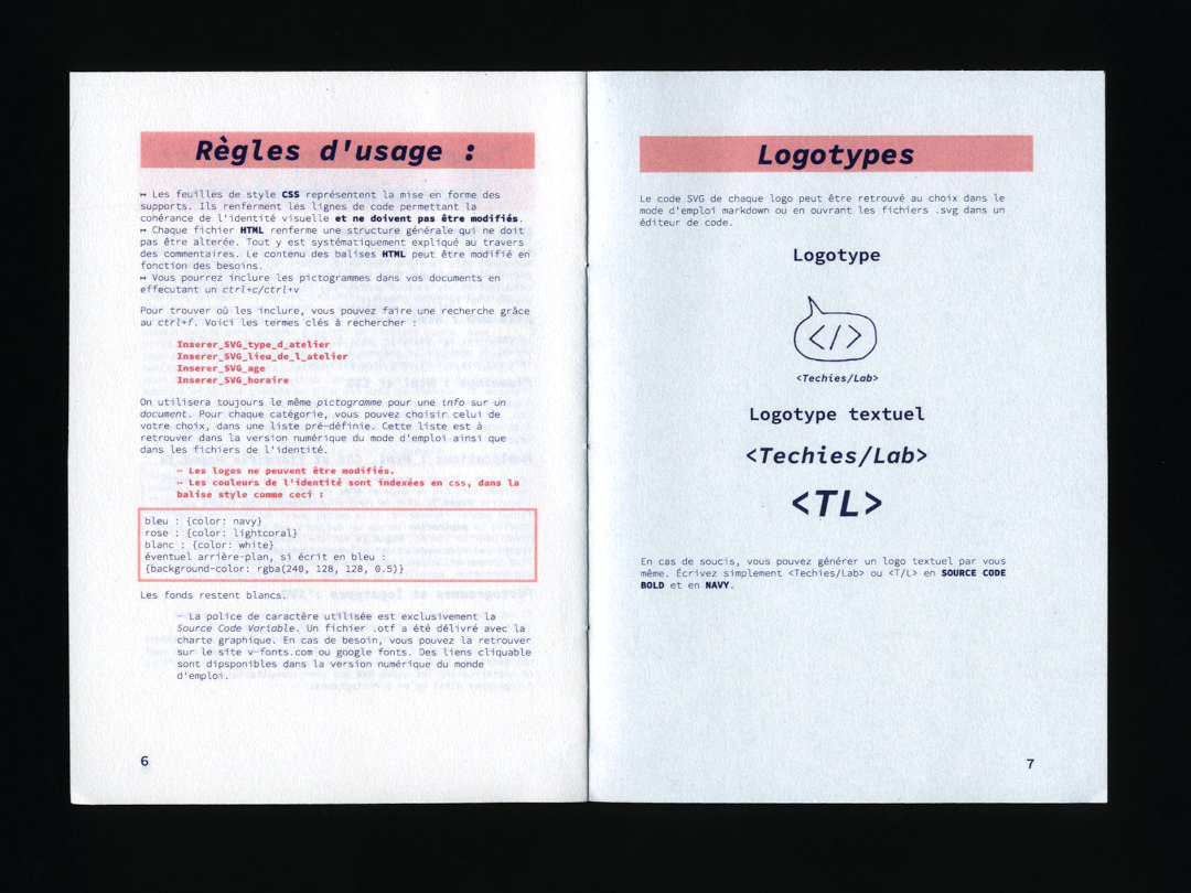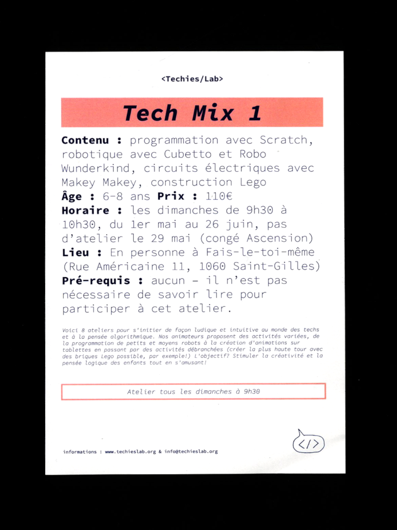 Charte imaginaire de <Techies/Lab>, une association belge (bien réelle, cette fois) qui propose des ateliers liés à la technologie et au code avec des enfants. C’est aussi un catalogue de bugs et d’erreurs, un journal de bord de mes expériences avec l’ordinateur et des souvenirs graphiques qu’il m’a semblé intéressant d’archiver.
