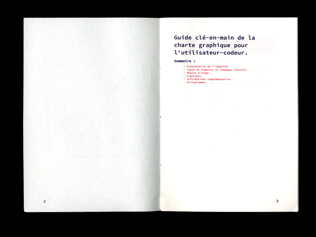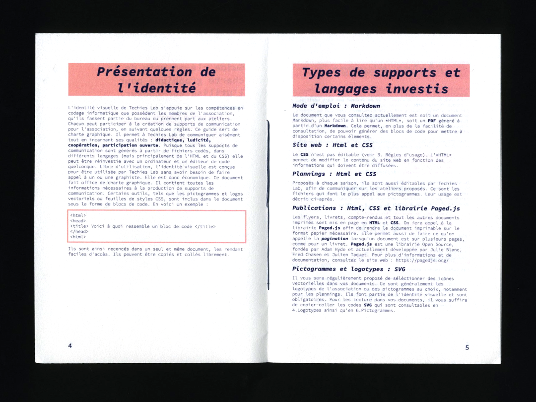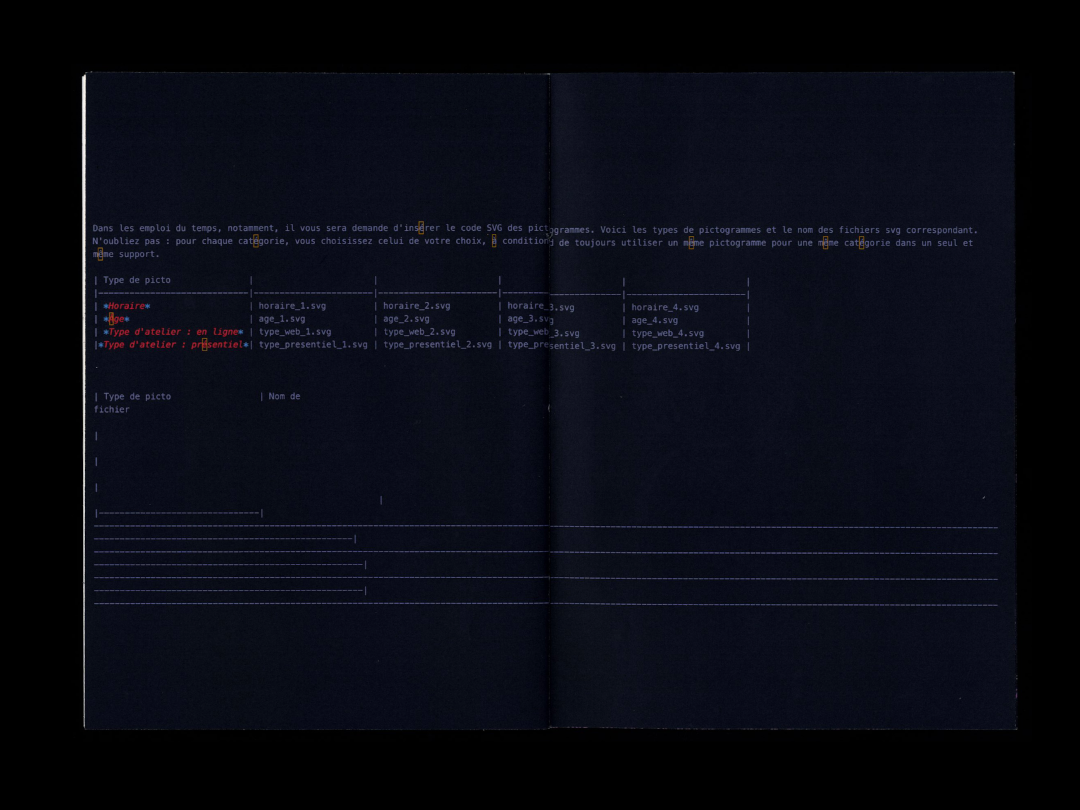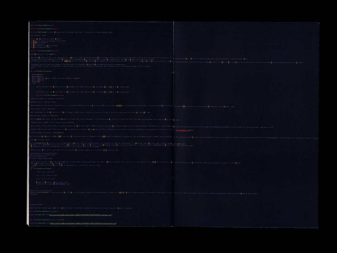Cette expérience a aussi été ma première approche des outils libres, puisque l’identité complète a été codée en HTML/CSS et utilise la librairie Paged.js pour la génération des supports imprimés.