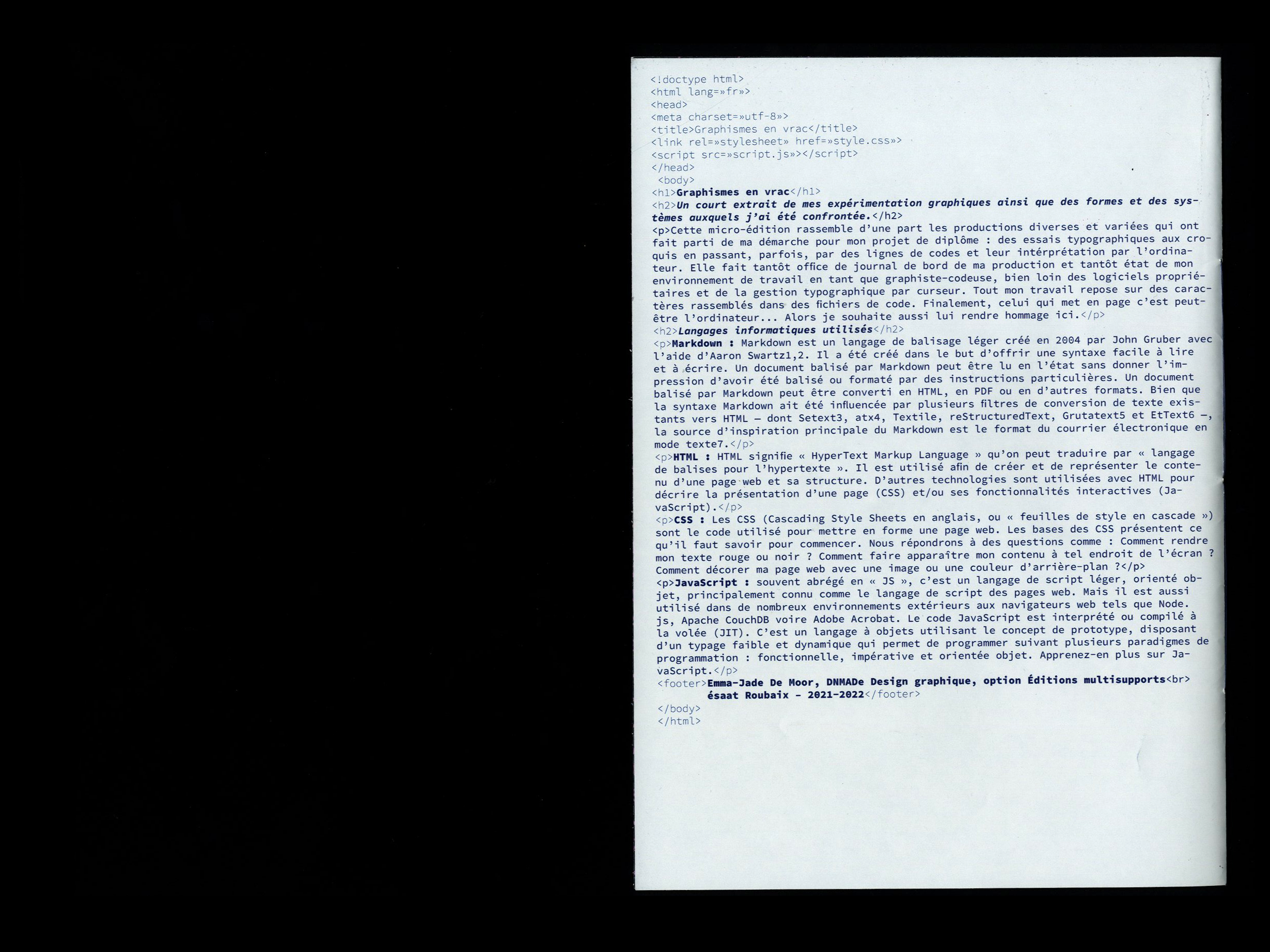 Étudiante en design graphique à l’ésaat de Roubaix je m’intéresse aux rapports entretenus par les designeur·euses grahiques à leurs outils numériques. J’aime le combo HTML/CSS, le web-to-print, penser des outils numériques et la forêt-noire.