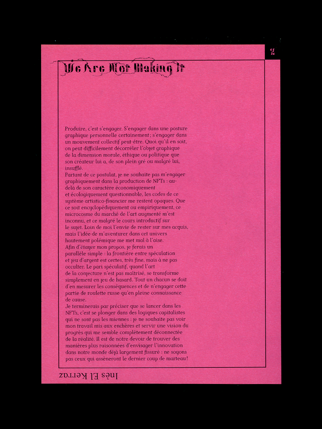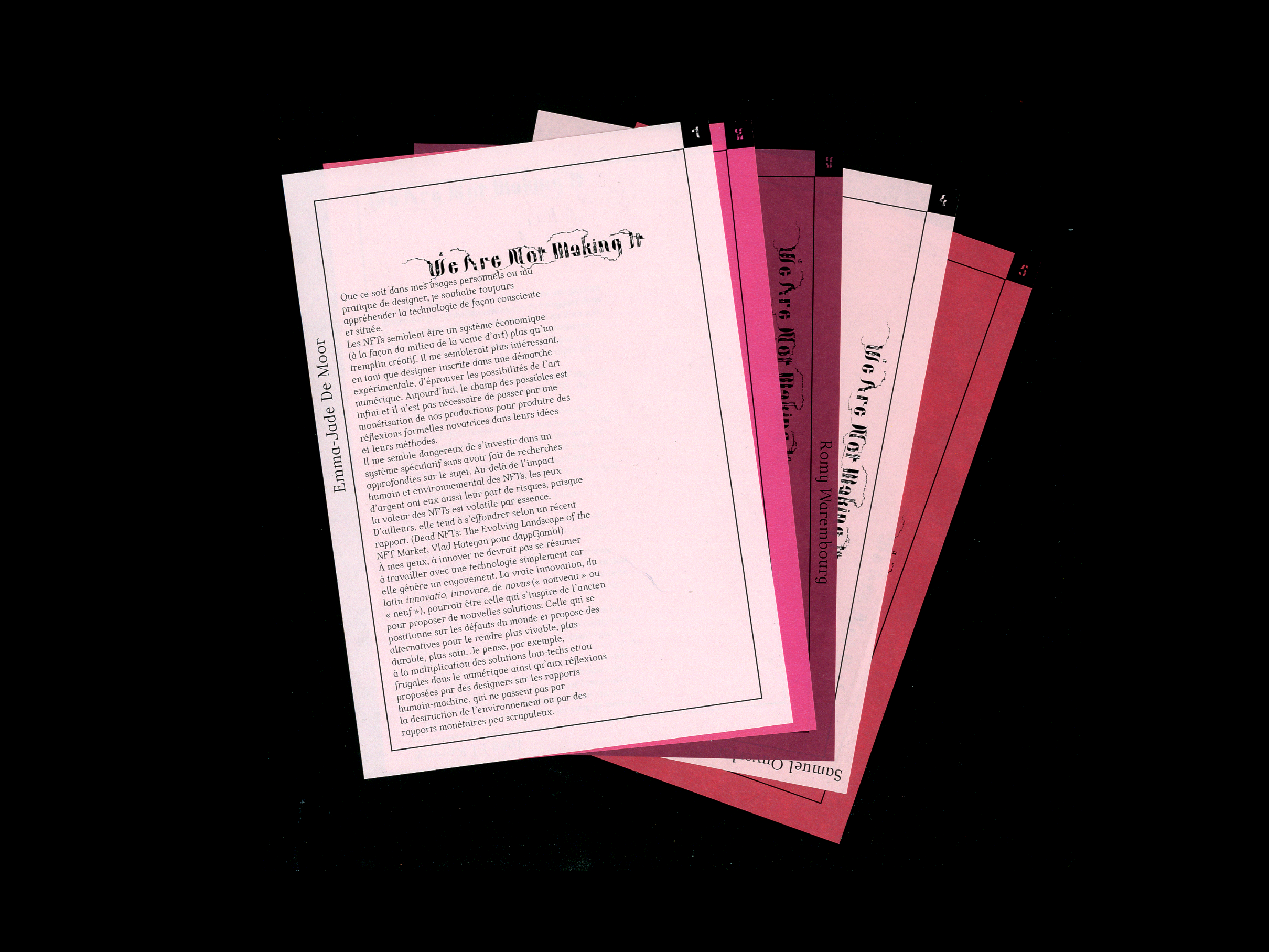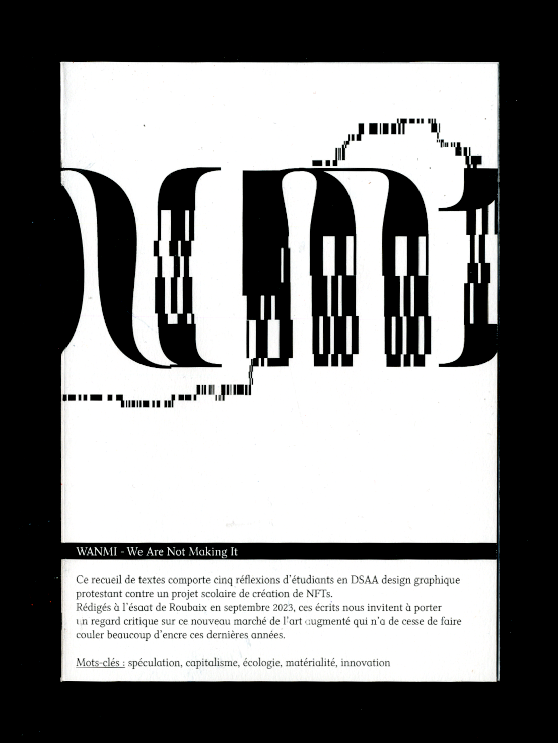 Cette anthologie rassemble cinq textes écrits par des étudiant·es de DSAA Design Graphique en réponse au sujet "WAGMI : We're All Gonne Make It" qui les invitait à réaliser une NFT dans le cadre d’un cours. Les feuillets ont été mis en page en HTML/CSS et Javascript pour les éléments mobiles tels que le titre courant.